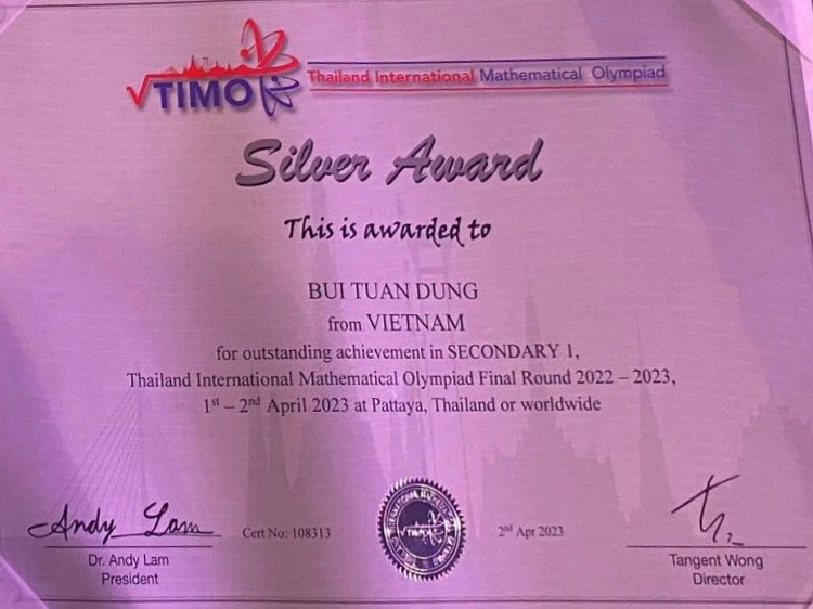 Chúc mừng em Bùi Tuấn Dũng, học sinh lớp 7A3 trường THCS Hồng Bàng đã xuất sắc giành giải Bạc tại vòng chung kết quốc tế Kỳ thi Olympic Toán học Quốc tế TIMO 2022-2023 tại Thái Lan được tổ chức vào ngày 31/3/2023 - 02/4/2023.