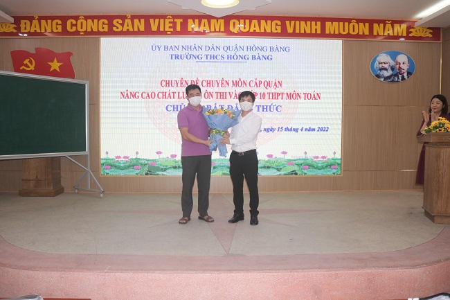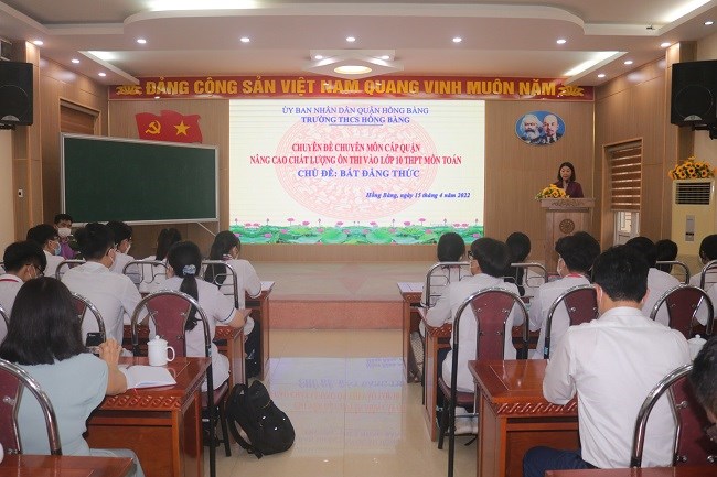 Được sự nhất trí của Phòng GD&ĐT, ngày 15/4/2022 trường THCS Hồng Bàng tổ chức thành công chuyên đề chuyên môn cấp quận Nâng cao chất lượng ôn thi vào lớp 10 THPT bộ môn Toán với chủ đề “Bất đẳng thức”. Về dự chuyên đề có ông Trần Duy Mạnh- Chuyên viên Sở Giáo dục Đào tạo, ông Phạm Văn Hiệu - Phó trưởng phòng Giáo dục Đào tạo quận cùng các ông, bà lãnh đạo, chuyên viên Phòng Giáo dục Đào tạo, đại diện Ban giám hiệu và GV dạy Toán các trường THCS toàn quận. Chuyên đề đã được các ông, bà lãnh đạo, chuyên viên Sở GDĐT, Phòng GDĐT và các thầy cô giáo dạy Toán trong toàn quận đánh giá cao, có tác dụng thiết thực trong việc nâng cao chất lượng ôn thi vào lớp 10 bộ môn Toán dành cho đối tượng học sinh khá, giỏi.
