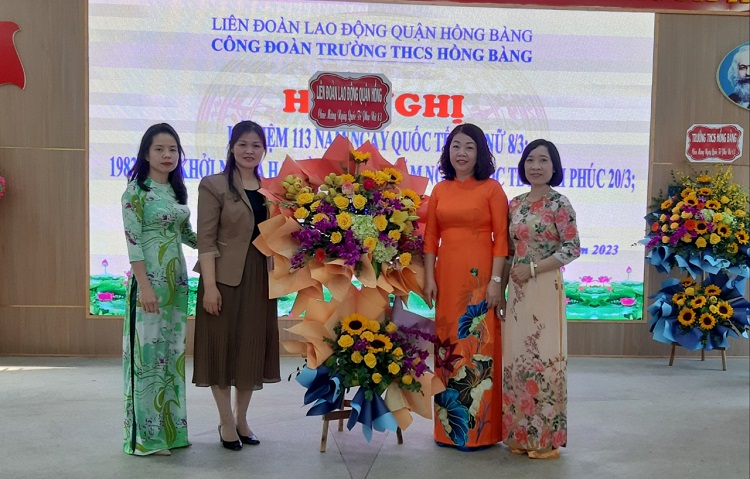Xin trân trọng cảm ơn sự quan tâm của các ông, bà lãnh đạo Liên đoàn Lao động quận Hồng Bàng đến Phong trào CN, VC, LĐ và hoạt động công đoàn của trường THCS Hồng Bàng. Đây là nguồn động viên lớn lao đối với các thầy giáo, cô giáo, chị em phụ nữ nhà trường hoàn thành xuất sắc mọi nhiệm vụ công tác.