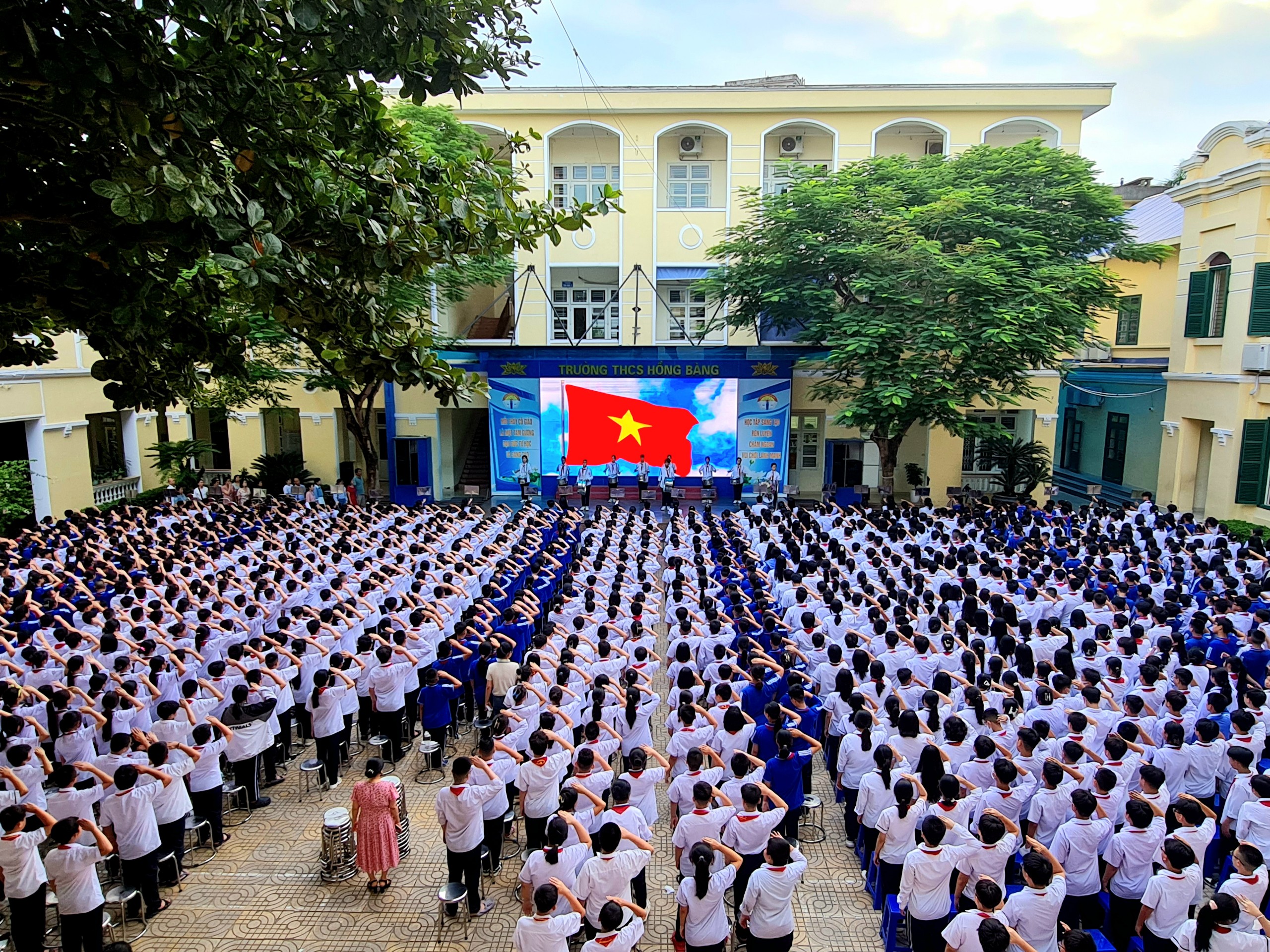 Thực hiện chương trình công tác Đội và phong trào thiếu nhi năm học 2023 - 2024 của Ban thường vụ Quận đoàn - Phòng giáo dục và đào tạo quận Hồng Bàng; Thực hiện chỉ đạo của Đảng uỷ, Ban giám hiệu nhà trường. Thứ 2, ngày 9 tháng 10 năm 2023 Liên đội trường THCS Hồng Bàng tổ chức buổi lễ chào cờ tháng 10 với chủ điểm “Chăm ngoan học giỏi”.
