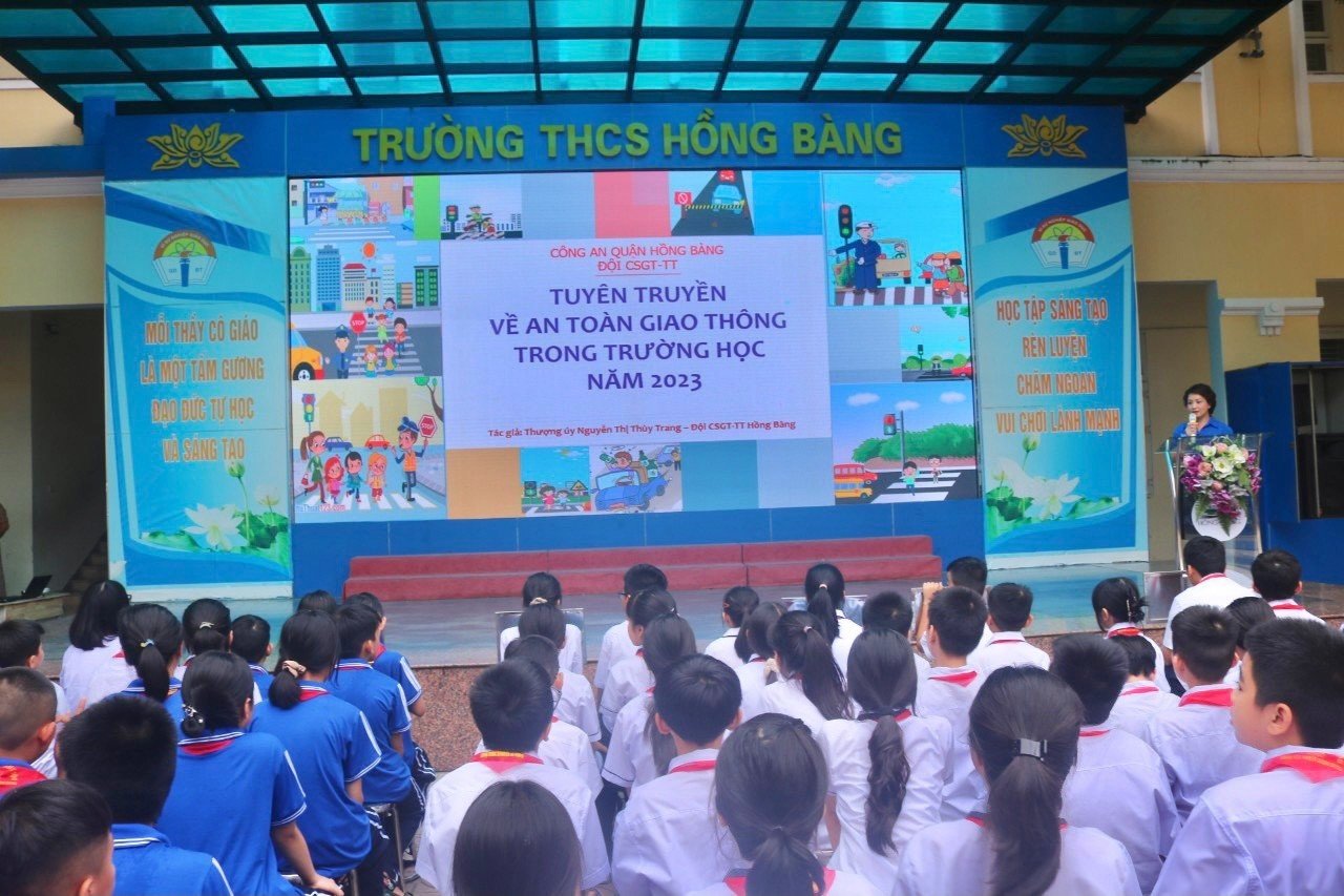 giao thông trật tự Công an Quận Hồng Bàng tổ chức sinh hoạt dưới cờ, tuyên truyền giáo dục pháp luật cho các em học sinh với chủ đề: “An toàn giao thông - Hạnh phúc của mọi nhà”. Trong buổi tuyên truyền các đồng chí Cảnh sát giao thông trật tự quận Hồng Bàng đã trang bị kiến thức cho học sinh các nội dung: Những quy định về Luật an toàn giao thông như điều khiển xe đúng độ tuổi, cách đội mũ bảo hiểm khi tham gia giao thông, tuân thủ hiệu lệnh đèn tại các ngã ba, ngã tư,...Giới thiệu một số hình ảnh, video giáo dục cho học sinh kỹ năng khi tham gia giao thông, những hành vi học sinh không được làm khi tham gia giao thông,...và mong muốn mỗi học sinh là một tuyên truyền viên tích cực vận động những người xung quanh chấp hành nghiêm chỉnh Luật an toàn giao thông