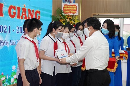 Đồng chí Nguyễn Minh Tuấn – Phó Bí thư Quận ủy, Chủ tịch UBND tặng quà cho học sinh vượt khó vươn lên trong học tập. Gồm 10 suất quà, mỗi suất trị giá 500 000đ. Nhà trường tặng 40 suất quà, mỗi suất trị giá 500 000đ.
