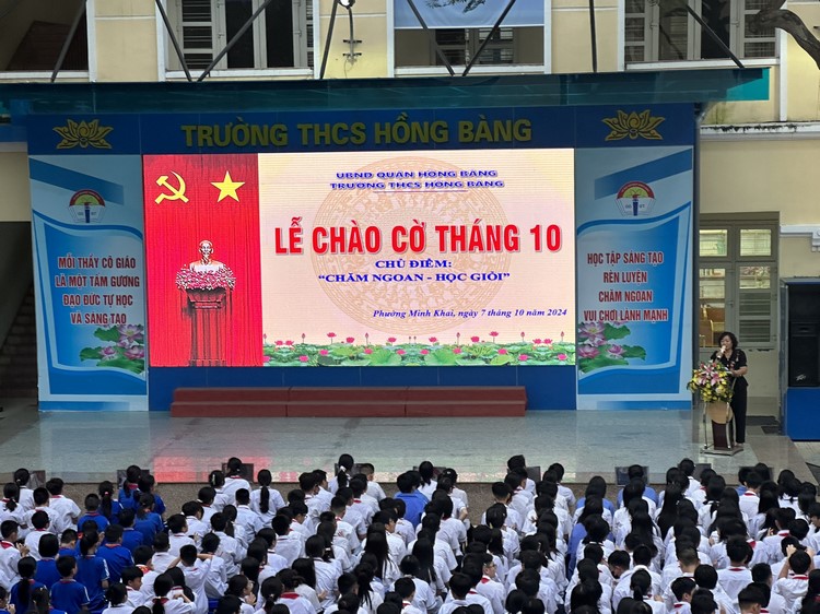 Thực hiện chương trình công tác Đội và phong trào thiếu nhi năm học 2024 - 2025 của Ban thường vụ Quận đoàn - Phòng giáo dục và đào tạo quận Hồng Bàng; Thực hiện chỉ đạo của Đảng uỷ, Ban giám hiệu nhà trường. Thứ 2, ngày 7 tháng 10 năm 2024 Liên đội trường THCS Hồng Bàng tổ chức buổi lễ chào cờ tháng 10 với chủ điểm “Chăm ngoan học giỏi”.